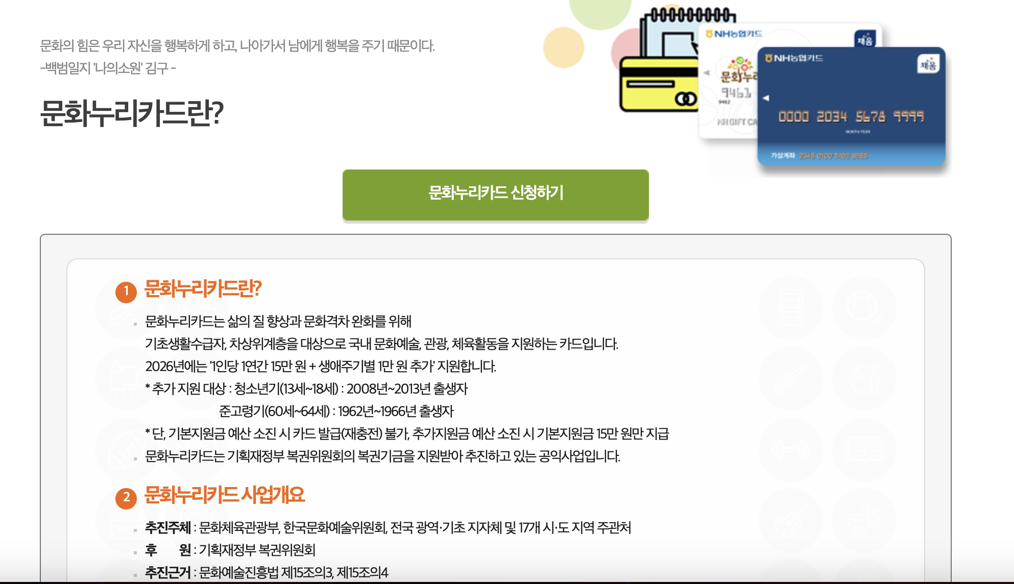 이름 그대로 ‘문화’를 ‘누리는’ 권리를 보장한다는 의미가 담겨 있으며, 정부는 매년 수십만 명의 대상자에게 이 카드를 제공함으로써 문화 사각지대를 줄이고자 노력하고 있다.